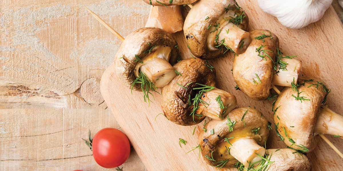 Put the mushroom slices in the marinade for about half an hour, then put them on skewers and grill until ready, turning them every 2-3 minutes.